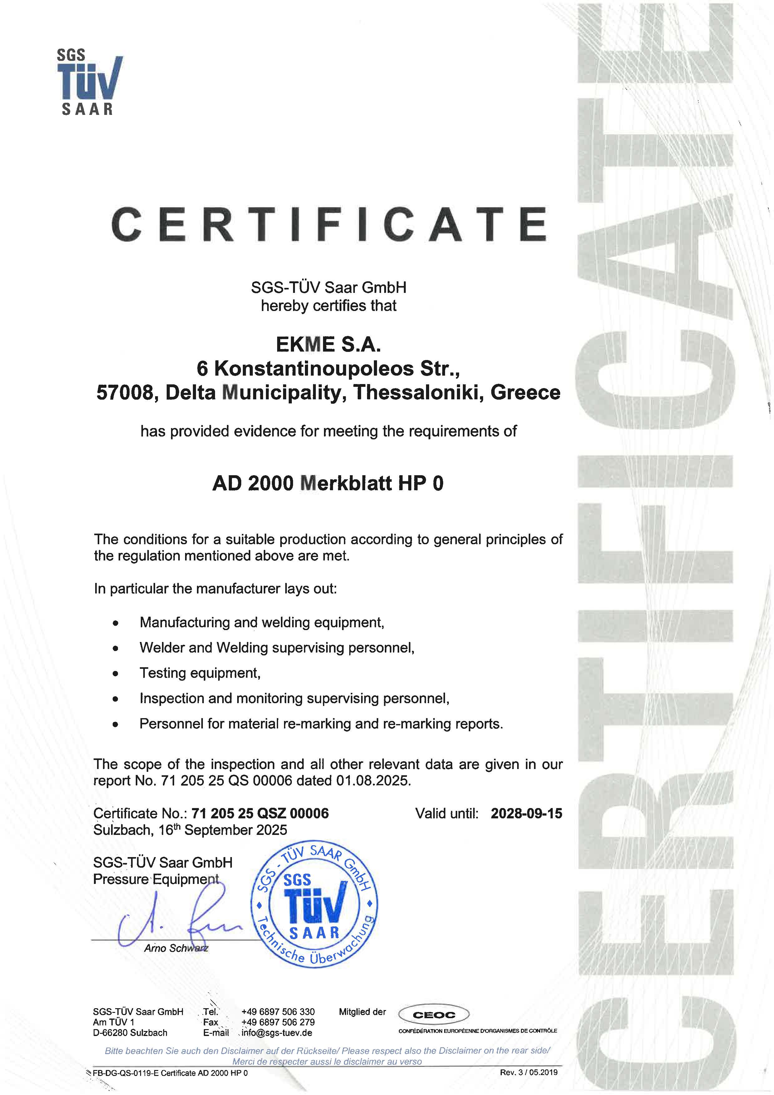 We are pleased to announce that our company has successfully completed the certification process for AD 2000-Merkblatt HP 0, one of the most recognized and stringent quality standards in the field of pressure equipment manufacturing. AD 2000-Merkblatt HP 0 is a German technical standard that outlines the safety requirements for the design, manufacture, and testing of pressure vessels and components.